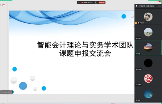 2025年10月1日20时,伟德国际1949始于英国智能会计理论与实务学术团队在腾讯会议平台开展了课题申报研讨活动,全体团队成员刘迅、谈多娇、曾义、尉晓亮、Najaf Iqbal参加了本次学术研讨活动。