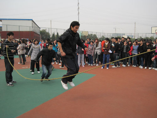 随着“咚咚”的敲鼓声,热身赛——跳绳比赛正式拉开帷幕。大一八个班被分成四组,每班选派8人参加(女生6人,男生2人)。摇绳两人面对面站立,手持一条长绳同时按逆时针方向摇动,队员一一跳过摇动的长绳,依次循环,以跳跃成功次数多少排出名次,比赛时间为两分钟。比赛刚开始,有些队员还不太适应摇动的长绳,摇绳有几次中断,但随着比赛的进行,队员们增强了自信,个个变得身轻如燕,以轻盈的步伐跳过长绳,摇绳者和队员们配合也更加默契,比赛渐入佳境。场上观众的眼神也跟随着跳绳晃动,齐心协力的为各自班级加油。激烈角逐过后,成绩遂见分晓。审计Q1041班力夺跳绳比赛第一名,注会Q1042班和会计Q1041班分列第二和第三名。
