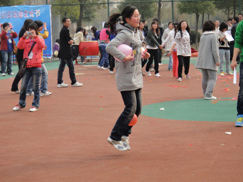 这时轮到了各个班级自由游戏时间,每个班级都分配了一个小游戏,旨在加强班级内部间的团结协作能力。瞧!财务Q1041班的同学们手拉手围成一个大圆圈,开始进行“桃花朵朵开”的游戏,主持人“3朵开”的话音刚落,同学们便立即松开手,三个三个的抱在一起。会计Q1041班开展“企鹅漫步”,参赛者在两腿间,双臂下各夹一个气球,呈企鹅状在跑道上行走。同学们滑稽的步伐引来阵阵欢笑,大家都深深的感受到游戏的妙趣横生。注会Q1042班的“踩气球”也十分精彩,各班的游戏都各具特色,夺人眼球。