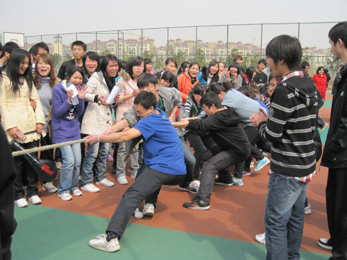 接下来拔河比赛紧锣密鼓的上演,各班级选派20名学生参加(男生5名,女生15名),所有班级同样被分为四组,进行淘汰赛,最后荣获第一名的班级将得到奖状和小礼品。当裁判一声“准备”,两边队员们都各就各位,身体后倾,双脚前后站定,目光聚焦在绳中间的绿色系带上。“开始”过后,会计Q1042班的队员们都涨红了脸,卯足了劲,一点点将绳朝着自己这方移动,可对方也毫不示弱,双方僵持不下。观众们越发热烈的呐喊助威,一时场上气氛异常高涨。对手稍一分神,胜利的天枰就倾向了会计Q1042班,力克注会Q1041班。几轮下来,比赛结果尘埃落定。注会Q1042班占领冠军宝座,会计Q1042班以亚军屈居第二。
